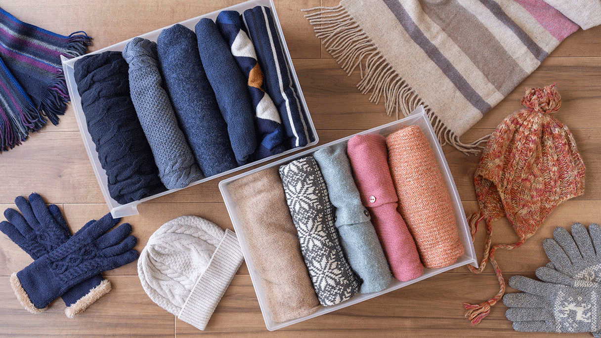 Вещи из шерсти и кашемира упакуйте в тканевые мешочки, корзины или коробки с вентиляцией, проложив тонкими листами бумаги. Вещи из менее прихотливых материалов сверните в рулончики или прямоугольники и сложите в пакеты, сумки, закрытые пластиковые контейнеры или кофры-органайзеры для хранения. Выбирайте аксессуары, которые помогут вам организовать комфортную именно для вас систему хранения.
