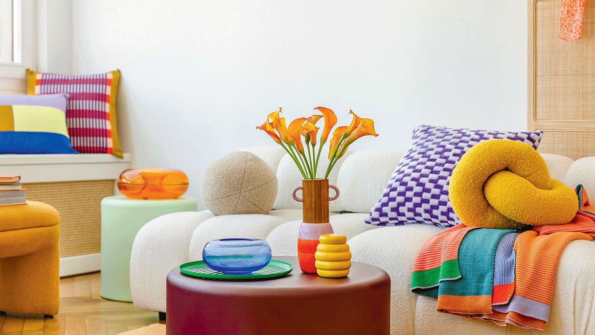 Наполнить квартиру позитивом помогут яркие детали и контрастный декор. Попробуйте, например, использовать россыпь диванных подушек или шторы радостных леденцовых цветов. Также можно поиграть с принтами – яркая клетка или чередование разноцветных кругов отлично вписываются в глобальный дофаминовый тренд. Постеры на стену, небольшие коврики, скатерть, яркая посуда – любой такой акцент может задать интерьеру новое настроение.