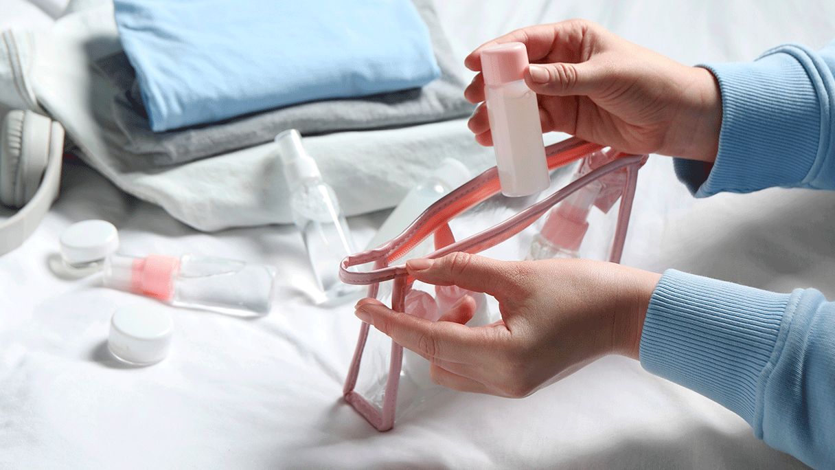 Не забудьте положить в косметичку влажные салфетки для лица и рук, санитайзер и гигиеническую помаду. Пригодятся также увлажняющий мист для лица или термальная вода. Если вы летите на самолете, следите за тем, чтобы объем средств, которые находятся в ручной клади, не превышал положенных норм.