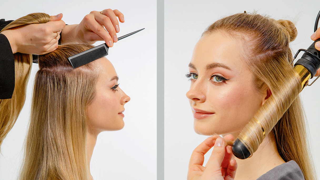 На затылке отделяем широкие и тонкие пряди и накручиваем их сверху вниз для создания объемного эффекта. Убираем зажим, намечаем пробор, делим верхнюю часть волос на пряди и накручиваем каждую в том же направлении.