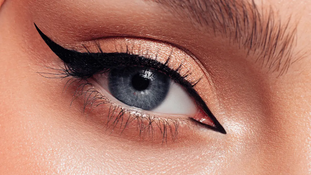 - Проведите тонкую линию вдоль роста ресниц, постепенно утолщая ее к внешнему уголку. Хвостик направьте к виску — так уголок глаза визуально приподнимется. Новичкам удобнее использовать подводку-фломастер, опытным — гелевую с тонкой кистью.